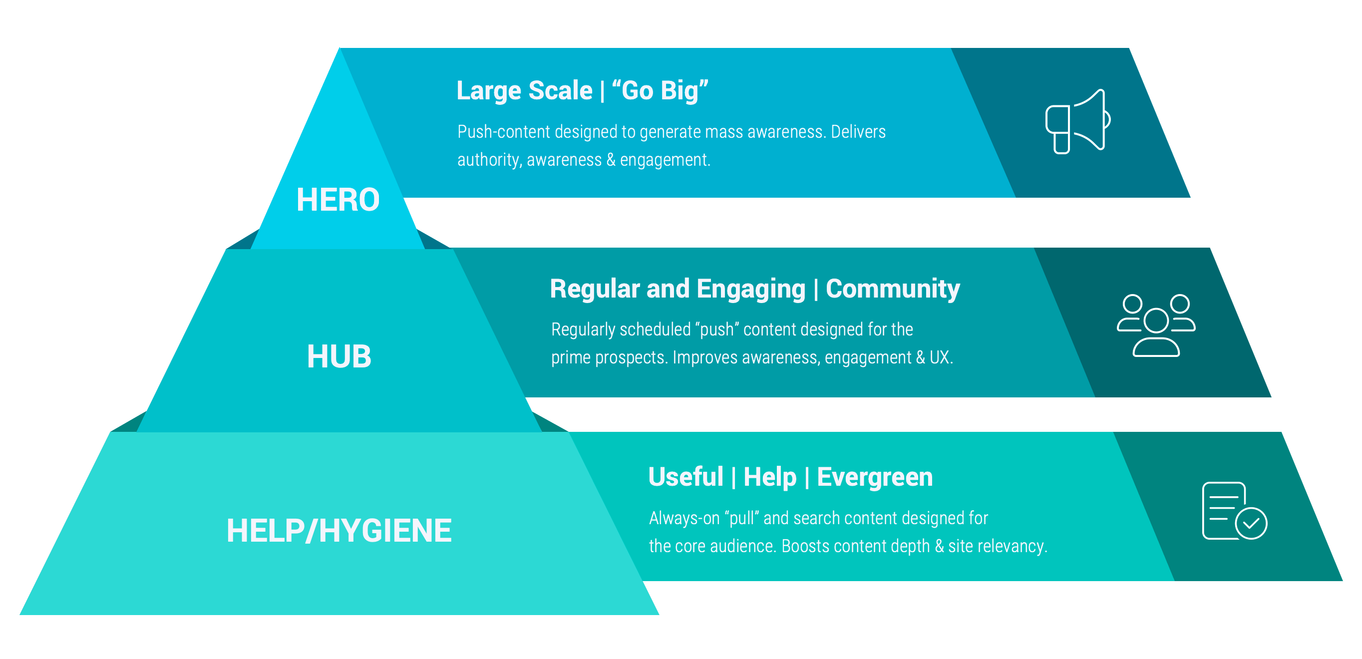 The 3H model is built on three distinct types of content: Hero, Hub, and Help. Each type serves a unique purpose and appeals to different audience needs.